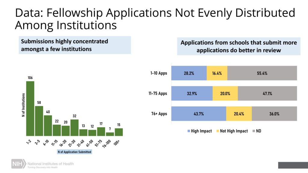 The working group found large, elite institutions do have an advantage. The graphs below were presented during the webinar, and both depict NIH fellowship application data from 2021. The graph on the left shows the number of institutions submitting particular quantities of applications. At one extreme, 15 institutions submitted more than 100 fellowship applications each, while at the other, more than 100 schools submitted just one or two. The graph on the right shows how applications from high-volume schools do much better in review, with more than 43% of applications from high-volume schools being rated as high-impact, compared to just 28% of applications from low-volume schools.